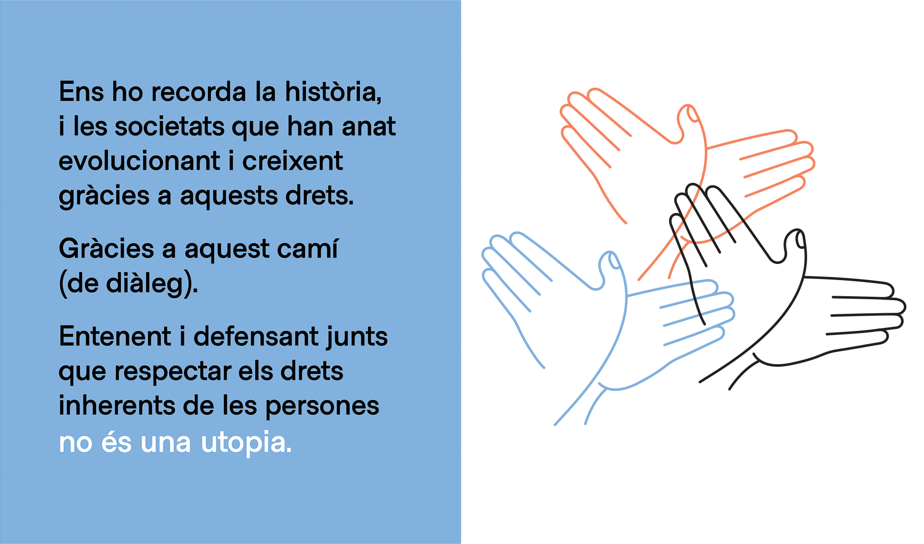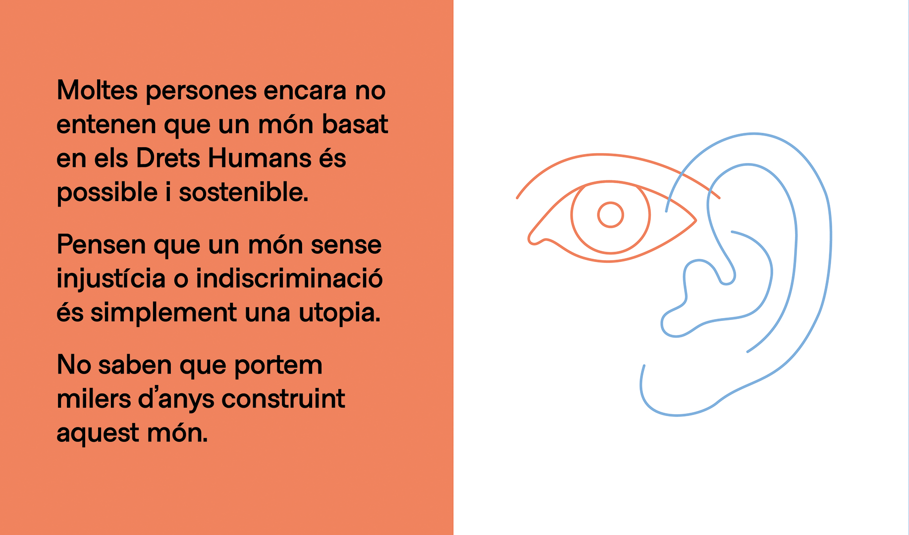 La idea que vertebró el proyecto de identidad de la nueva marca fue el diálogo. Los derechos humanos son una construcción que, a lo largo de los siglos, las personas han ido levantando gracias a su lucha; una lucha que continúa en el presente. El ser humano ha aprendido a cuestionarlo todo, y gracias a esto ha conseguido reconocer los derechos inherentes a toda persona, independientemente de su nacionalidad, género, origen étnico o nacional, color, religión o cultura.
